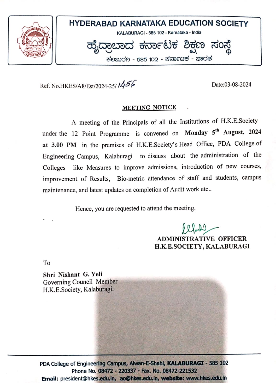 Meeting of Principals of Degree, PU, Polytechnics, ITI and Schools Chaired by President and Management, HKE Society.